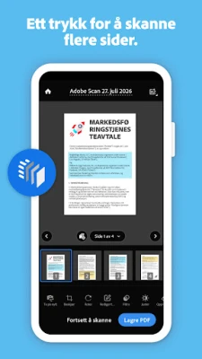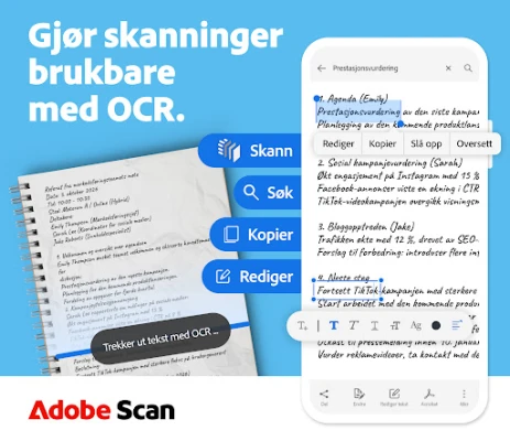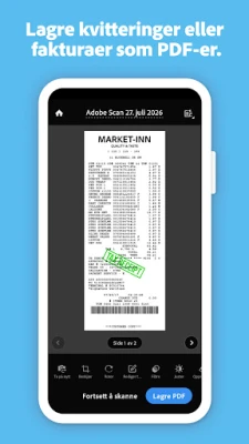 Med Adobe Scan blir mer enn bare bilder fanget – tekst blir levende. Den avanserte OCR-teknologien (Optical Character Recognition) konverterer skannede dokumenter til søkbar og redigerbar tekst, noe som revolusjonerer måten du interagerer med informasjon på. Enten du trenger å hente kontaktinformasjon fra visittkort eller gjøre håndskrevne notater søkbare, gjør Adobe Scan det mulig. Appen gir deg også full kontroll over etterbehandlingen; beskjær, roter, juster lysstyrke og kontrast, og fjern uønskede flekker eller bretter for et plettfritt resultat. Organiser enkelt filene dine i tilpassede mapper, og få umiddelbar tilgang til skanningene dine gjennom automatisk lagring i Adobe Document Cloud.