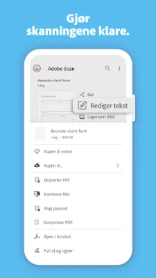 Optimaliser din produktivitet ved å gjenbruke og dele dine digitaliserte dokumenter med uovertruffen enkelhet. Adobe Scan muliggjør kopiering, redigering og gjenbruk av tekst fra skannede kontrakter eller studienotater. Eksporter dokumentene dine til formater som Word, Excel eller PowerPoint, og del dem trygt med kolleger og venner. Integrasjonen med Acrobat Reader lar deg videre kommentere, markere, fylle ut skjemaer og signere dokumenter direkte. For å låse opp et enda bredere spekter av muligheter, inkludert sammenslåing av flere skanninger til én fil og utvidet OCR-kapasitet, tilbyr Adobe også praktiske abonnementsløsninger som forbedrer din digitale opplevelse ytterligere.