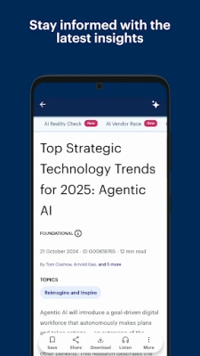 Utforsk den dype kunnskapsbasen fra Gartner med uovertruffen letthet. En kraftfull søkefunksjon lar deg avdekke dypere analyser og ekspertvurderinger på et øyeblikk. Verdifulle dokumenter og rapporter kan enkelt lagres, noe som gir deg fleksibel tilgang fra både din mobile enhet og via nettleseren, uansett hvor du befinner deg. For å maksimere din effektivitet, lar Gartner Mobile App deg sømløst fortsette arbeidet akkurat der du slapp, med umiddelbar gjenopptakelse av nylig lest forskning.